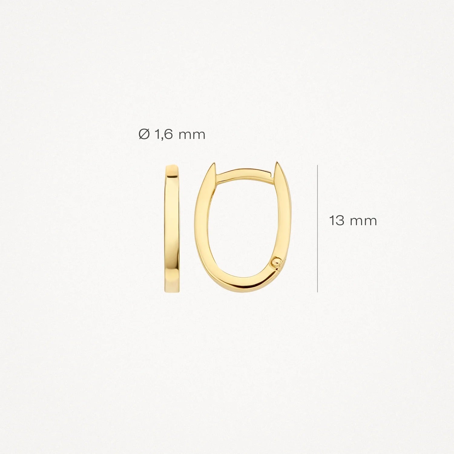 Schlichte Creolen in eckiger und ovaler Form aus 14 Karat Gelbgold. Die Ohrringe sind 1,6 mm stark und messen 13 mm im Durchmesser. Solo ein feiner Blickfang, lassen sich aber auch hervorragend mit weiterem Ohrschmuck im zweiten Ohrloch kombinieren.